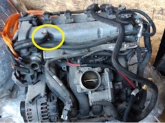 Итак, клапан вентиляции картерных газов находится у нас вверху клапанной крышки. А именно вот здесь.